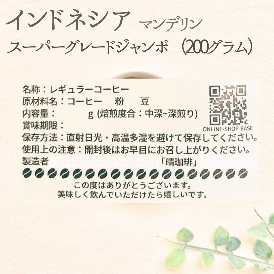 インドネシア マンデリン(Super G Jumbo) 200g 豆のまま or 粉に挽いて